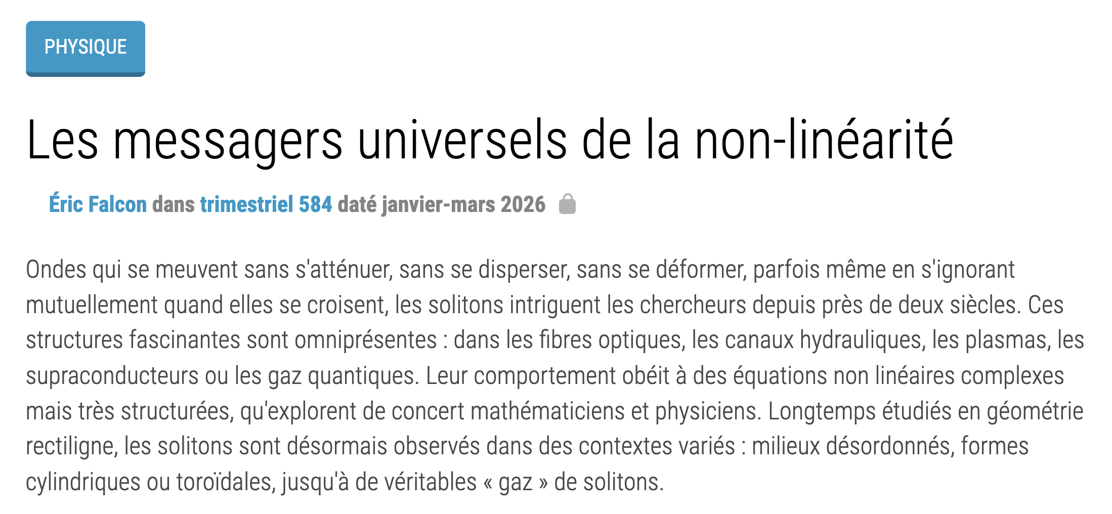 Ondes qui se meuvent sans s'atténuer, sans se disperser, sans se déformer, parfois même en s'ignorant mutuellement quand elles se croisent, les solitons intriguent les chercheurs depuis près de deux siècles. Ces structures fascinantes sont omniprésentes : dans les fibres optiques, les canaux hydrauliques, les plasmas, les supraconducteurs ou les gaz quantiques. Leur comportement obéit à des équations non linéaires complexes mais très structurées, qu'explorent de concert mathématiciens et physiciens. Longtemps étudiés en géométrie rectiligne, les solitons sont désormais observés dans des contextes variés : milieux désordonnés, formes cylindriques ou toroïdales, jusqu'à de véritables « gaz » de solitons.