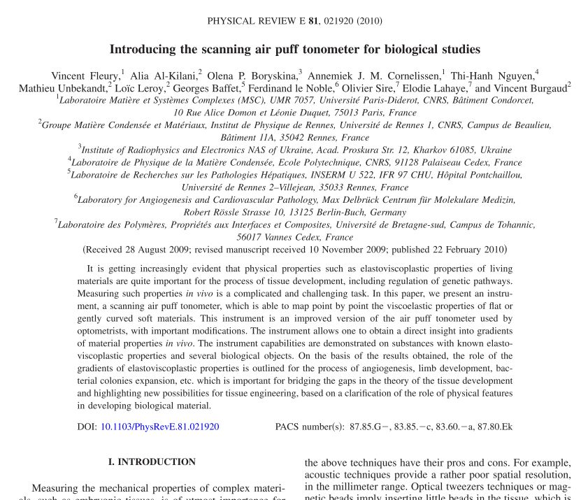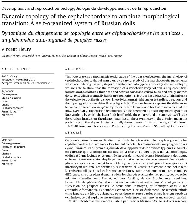 La morphogenèse a connu en France un fort essor depuis les années 80, grâce à l'activité pionnière de chercheurs comme Yves Couder, Pierre Pelcé et d'autres, qui ont forgé des outils mathématiques permettant de traiter des questions d'évolution au cours du temps de "frontières libres". Les problèmes de morphogenèse sont en effet des problèmes scientifiquement difficiles, car il faut comprendre l'établissement d'une forme, sans idée a priori sur "ce qui va sortir". Jusqu'il y a peu, la science essayait d'expliquer l'émergence de formes par des théories qui, regardées en détail, supposaient en fait déjà connue la forme à venir. Deux exemples : les pattes des insectes sont des tubes télescopiques à plusieurs segments. L'origine de ces tubes est dans la disposition radiale et concentrique des cellules qui se développent sur le côté de l'abdomen des insectes. La plupart des travaux sur les pattes des insectes présupposent que les "bourgeons" de pattes sont des anneaux concentriques. Ce sont donc des modèles qui font déjà l'hypothèse que la patte d'insecte est un tube télescopique. Autre exemple, plus proche de nous : on explique la formation des membres des vertébrés par des champs de diffusion de molécules chimiques, avec des nuances "antero-postérieures", "dorso-ventrales" et "proximo-distales" agissant dans un "bourgeon de membre". Une fois encore, ces modèles présupposent qu'il existe quelque chose comme un bourgeon de membre sur le côté du corps des vertébrés. Ces modèles font donc implicitement l'hypothèse, d'un fait qu'ils cherchent à démontrer. Le vrai défi des études contemporaines est de traiter les formes comme des objets mathématiquement "libres", et de voir se former les objets réellement observés, spontanément, comme formes émergent d'un ensemble minimal de règles physiques satisfaisant aux lois fondamentales de la physique. Cette approche refuse des explications du type "c'est le gène qui..." Sur ces questions, j'ai proposé plusieurs modèles physiques décrivant certains aspects de la formation des vaisseaux sanguins. En réalité, ces modèles se ramènent à un modèle unique, qui incluerait l'ensemble des déformations agissant sur les vaisseaux en cours de croissance. Cette biophysique de la formation des vaisseaux sanguins explique très bien l'auto-organisation du système artériel et veineux, en particulier, comment les artères instruisent leurs veines. Un cas particulier est celui du cordon ombilical, ces modèles expliquent très bien pourquoi il y a des veines et des artères dans le cordon, qui suivent le même chemin. C'est un fait bien connu du grand public que le cordon contient des artères et des veines, entortillées. Il est moins connu cependant que cet appariement est général, aussi bien dans le cordon, que partout ailleurs, dans le placenta ou tout autre partie du corps. Nous avons élucidé l'origine de cet appariement très récemment, en mesurant finement les propriétés mécaniques du tissu situé entre les artères et les veines. J'ai suggeré l'existence d'une correspondance entre la croissance des végétaux et celle des cristaux. Les végétaux tendent à former des tiges, ou des structures coniques. J'ai attribué la tendance à pousser tout droit dans certaines directions, à une stabilisation par le motif du champ de fibres. par exemple, les épines sont pointues dans une direction. Mais cette direction est congruente avec l'organisation des fibres. Par congruente, j'entends non pas strictement parallèle, mais organisée autour du même centre de symétrie. La convergence des fibres vers ce centre crée une singularité de la tension (au sens mécanique), qui sélectionne la direction de croissance du phénomène biologique. Ce modèle explique qualitativement la formation de tiges dans l'axe des singularités des champs de fibres, la formation des citrons ou des navets, et quelques propriétés générales des végétaux, qui les distinguent des cristaux (dans les cristaux, le champ d'organisation cristalline est à longue portée, dans les végétaux, le champ de directeur est local). Je pense que ce modèle s'applique également à la formation des pattes des insectes (phénomène dit d'éversion, par lequel les pattes jaillissent sur le côté du corps des insectes par un mécanisme de sortie télescopique d'anneaux concentriques eux mêmes appelés disques imaginaux). Depuis un certain temps, je travaille sur la morphogenèse des glandes, du rein et du poumon. J'ai en particulier donné une possible explication à l'origine évolutive de ces organes. J'ai montré en collaboration avec l'équipe de David Warburton, et dans le cadre de la thèse de Mathieu Unbekandt, que les principaux gènes de la morphogenèse (Fgf10, VEGF, Sprouty) de ces organes étaient mécanosensibles. Mes travaux récents concernent la formation des empreintes digitales, et leur impact sur la forme des doigts. Je travaille également sur le développement des tétrapodes et particulièrement des humains. J'ai proposé une synthèse mécanogénétique du développement des tétrapodes qui explique très naturellement leur origine (attracteur d'un mouvement hyperbolique de collision de tourbillons). L'évolution du cerveau humain s'explique assez simplement comme un enroulement dynamique "coincé" dans un champ de morphogenèse de type "dilatation-tourbillon". Ce type de physique explique assez simplement les observations de Mme Dambricourt-Malassé sur l'évolution de la tête humaine ("contraction crânio-faciale"). Enfin, j'ai développé un instrument de mesure de l'élasticité des embryons, in vivo, appelé Tonomètre à jet d'air. La tonométrie à jet d'air consiste à mesurer la dureté d'un objet en soufflant dessus avec de l'air. Dans le cas qui m'intéresse, on génère un fin jet d'air avec une pipette très fine. L'injection de l'air, très localisée, à la surface d'un embryon induit une déf