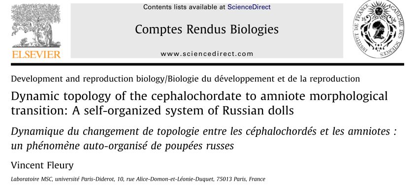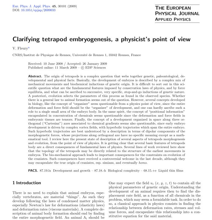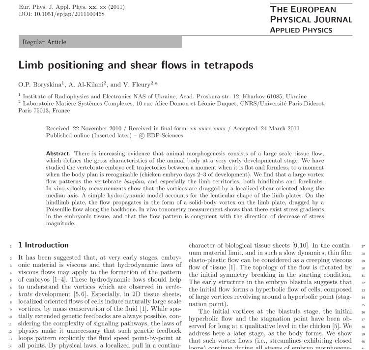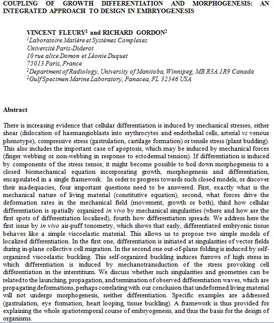En cliquant ici vous accédez à une galerie de tourbillons au cours du développement des embryons [en construction]. Le fait que les embryons soient formés par des tourbillons hydrodynamiques est universellement accepté (voir par exemple ou bien exemple , ou bien , ou bien ). Cette conclusion a été atteinte indépendamment par de nombreux chercheurs.