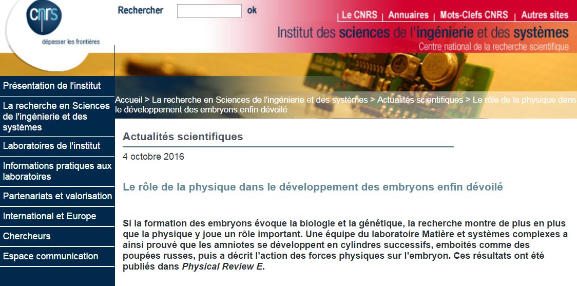 Communiqué de presse du CNRS, "Comment se forment les vertébrés", 12 février 2015. |