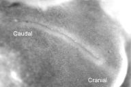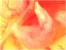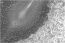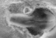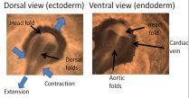 Ici à droite, enroulement de la blastula filmé "shell less" (sans la coquille de l'oeuf) dans un embryon de poulet vers 18hrs de développement. Le film est réduit d'un facteur 4 dans chaque direction par rapport au film HD d'origine. On observe des tourbillons contra rotatifs tirés "par le bord". Le long du bord, en HD on voit les alignements de cellules, qui suivent la texture fibrée présente dans la masse. On voit la quasi totalité de l'embryon (env. 2,5 mm pleine échelle) Ces films sont produits sans aucun marquage, ce qui n'est pas nécessaire, si on rince le jaune d'oeuf avant l'incubation.
