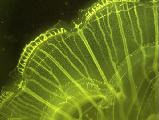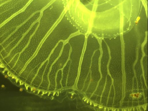 | Ce qui m'intéresse dans cette méduse, c'est l'existence d'une arborescence de vaisseaux hiérarchique avec un "pattern" très régulier, en forme de chandelier. Cet animal est "très primitif", et ce n'est pas du sang qui circule dans ses "veines" mais de l'eau de mer+des sucs digestifs. Il y a des "veines" et des "artères". On voit ici les artères, ce sont les vaisseaux sans branches, et les veines, les vaisseaux avec branches. Au bout des artères il y a un oeil (8 dans les méduses usuelles, parfois 10, parfois 16, ou même 32 -très rare). | ![]() |