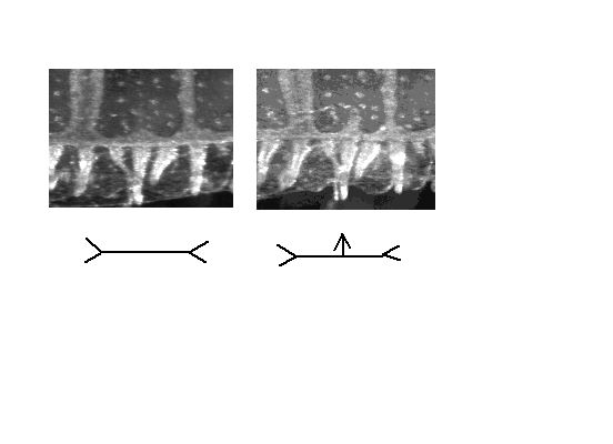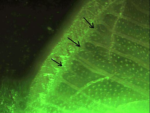 | En étudiant finement le développement de cette méduse, je me suis rendu compte que les vaisseaux se formaient par le bord. Et qu'en fait, de nouveaux bourgeons apparaissent, qui remontent et se reconnectent en suivant un trajet qui penche vers les veines précédentes dans la hiérarchie. Dans cette image, on voit la naissance des bourgeons, à peu près au milieu entre deux vaisseaux existant. | ![]() |