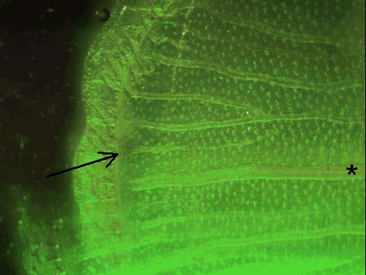 | Sur cette image on voit que le bout de la nouvelle veine penche vers une veine précédente, et pas vers une "artère", gros vaisseaux davantage visible vers le bas de la photo (étoile). | ![]() |