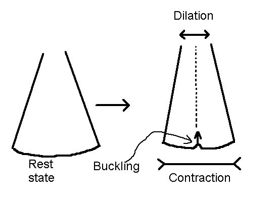 | Le mécanisme de formation des vaisseaux serait donc médié par la physique non-linéaire du flambage du gel+épithélium, de la surface de la méduse. Ceci exliquerait l'origine très primitive des vaisseaux. Le raccordement des vaisseaux suivrait automatiquement des chemins de cisaillement, qui conduiraient par essence aux veines, par une auto-organisation dans le champs de cisaillement principal (sorte de réfraction dans le champs de force). | ![]() |