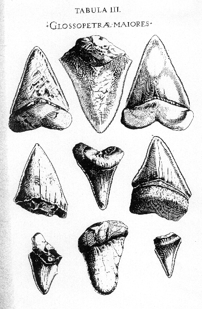 | Autre Planche extraite des travaux de Sténon sur les dents de requin. Il est à noter que les travaux ayant conduit à la première théorie correcte de la sédimentation et de la formation des pierres sont issus de dissections, d'études des sources, et de la médecine (la sédimentation désignait le depôt dans les fioles d'urine, Sténon avait remarqué que ce depôt pouvait se déposer et être re-dissout ) | ![]() |