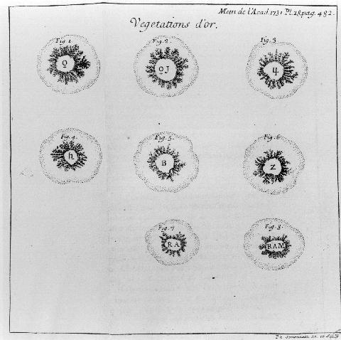 | Planche extraite du mémoire de Homberg sur les végétations métalliques (1698). Ces végétations ont conservé parfois le nom d'arbre de Diane. Elles ont participé à la croyance alchimique en la transmutation des métaux (on met un métal peu noble dans une solution d'un autre plus noble, et on précipite le métal plus noble par oxido-réduction -pile interne-, dirions nous aujourd'hui | ![]() |