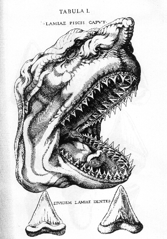 | Autre Planche extraite des travaux de Sténon. Il s'agit ici de la dissection d'une tête de requin. Suite à cette dissection, Sténon comprit que les pierres ressemblant à des dents de requin étaient en fait des "fossiles". Il en concut une théorie de la formation des pierres, et de la cristallisation. | ![]() |