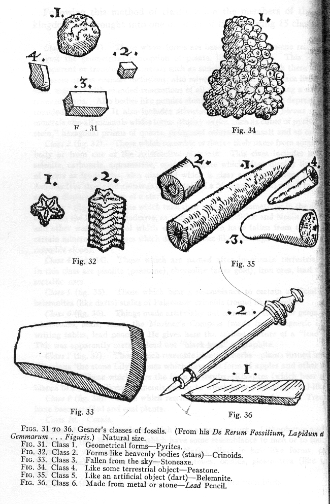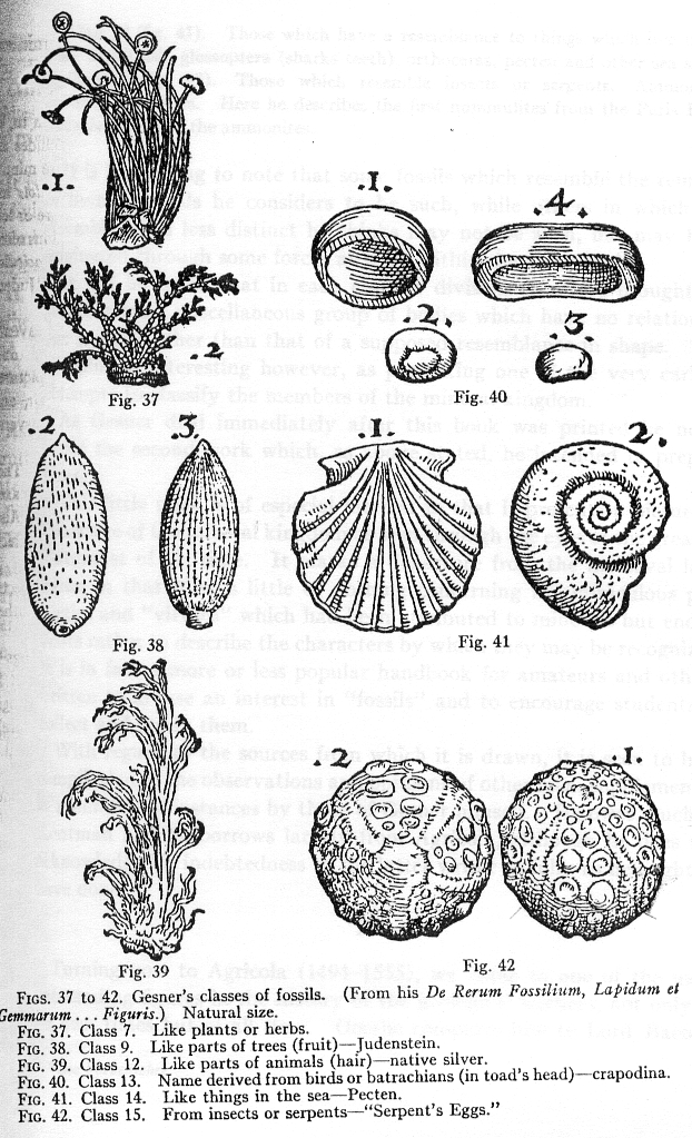 | Planche extraite des travaux de Gessner sur les fossiles (d'après F. Adams The birth an development of the geological sciences). On reconnaîtra dans ces planches des "pierres figurées", dont des tests d'oursin fossiles. On a longtemps cru que ces pierres se formaient naturellement, que la nature s'amusait pour ainsi dire à produire de telles pierres. | ![]() |