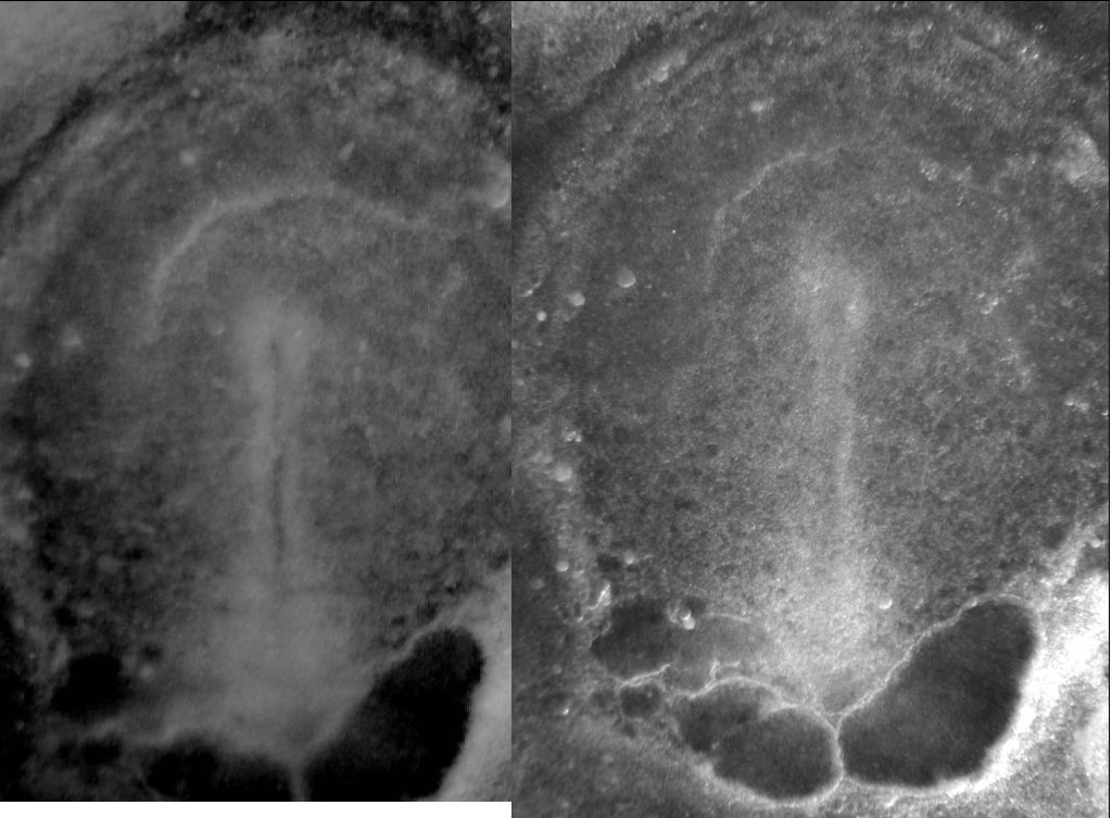 Magnification : X6. Camera: Watec B&W, 768x512 pixels. Remarks of general interest : Film of the formation of the eyes as seen in frontal view. One distinguishes the flatening of the eyes on either sides, andthe triggering of the lens and of the optic chamber (see eye on the right in the field). Personal remarks : EmbML18. Similar kind of film of the formation of the eyes as seen in frontal view. One distinguishes the flatenning on the sides, and the triggering of the lens and of the optic chamber. (see eye at top left in the image) Personal remarks : EmbML21.
