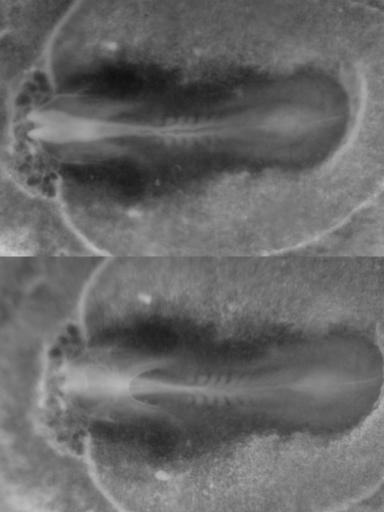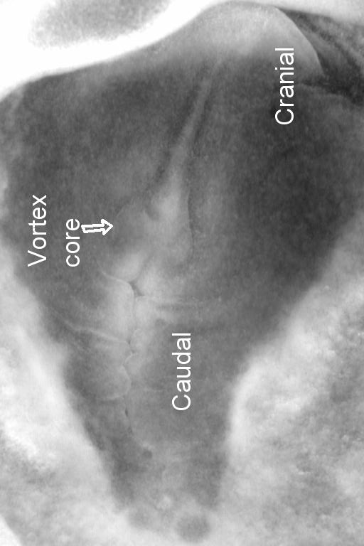 One may observe here the beginning of the caudal elongation, which is quadrupolar, under the advection of the tissues in the flow.