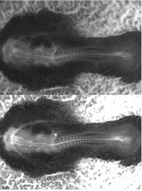 | Magnification : X1,6. Camera: Watec B&W, 768x512 pixels on both sides. A Leica microscope and an optem zoom (inverted). Remarks of general interest : Simultaneous dula dorso-ventral image of an embryo during evagination of optic cups. One sees the chorionic fold passing over the head. One sees the morphogenesis of the heart. Film visible , Personal remarks : Emb 176.