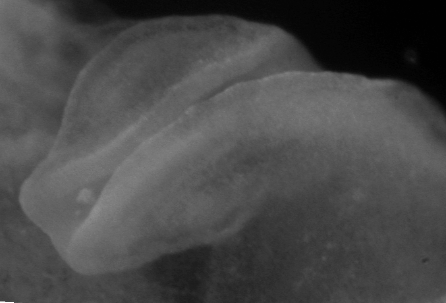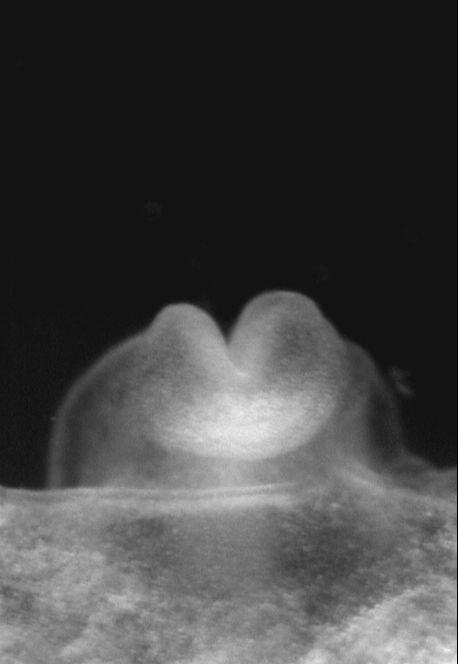 Remarks of general interest film of head morphogenesis, prior to diving below the amniotic sac. Close up view of the evagination of the optic cupulas. One witnesses a discontinuity. The brain starts to dilate distinctly.