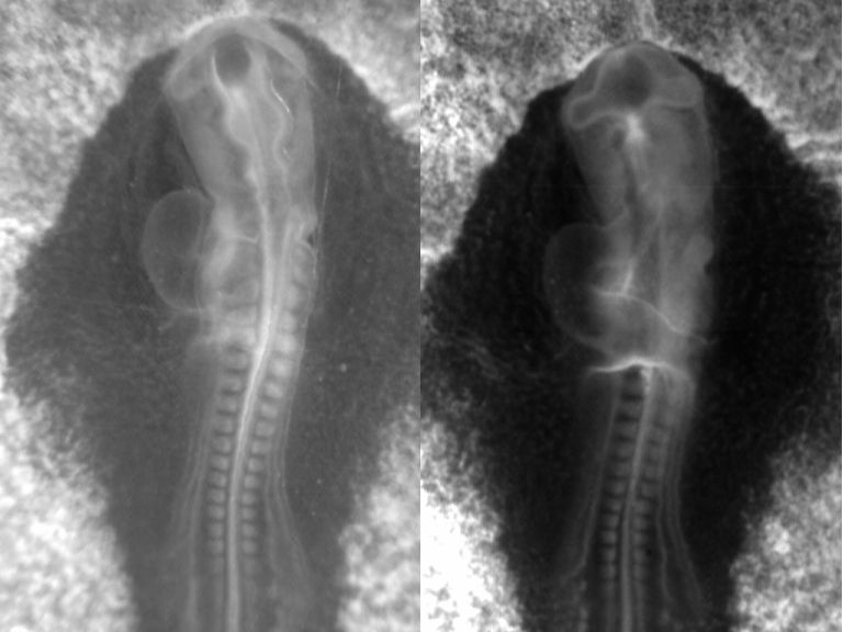 This shows actually a dual dorso-ventral view of the same embryo put on a glass slide. One images very clearly the front of mesoderm.