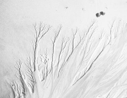 Le mécanisme par lequel les canaux de cette plage prennent la forme quon leur voit est le suivant. Larborescence de canaux saccroît dans les directions où arrive le plus deau. Leau, du côté lisse et plat de la plage est uniformément répartie, cest un film liquide recouvrant du sable. Au niveau des petits canaux, leau narrive pas uniformément, il y a plus ou moins deau à chaque extrémité, et les canaux qui reçoivent le plus deau seront les premiers à sagrandir. Mais comment savoir quels canaux reçoivent le plus deau? Pour le savoir, il faut résoudre l'équationd e conservation du fluide à toutes les intersectins ou "noeuds" du lacis de mini-rivières, et cette équation ets simplement l'équation de laplace (DELTA P=0) où P est la pression, dans une vision très simplifiée du problème.
