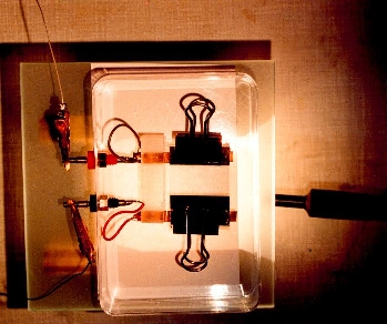 Voici le montage expérimental permettant de produire les "fougères" électrochimiques ci-dessus (pas compliqué, comme on le voit).