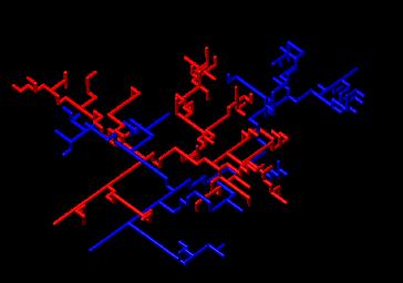 Légende: Vasculature dartères et de veines enchevêtrées obtenue par le modèle de croissance dendritique entrelacée. Les artères et les veines communiquent par les capillaires (non représentés), qui relient leurs extrémités. Les flèches indiquent le sens de lécoulement veineux et artériel (qui peut dailleurs être calculé exactement dans la "tuyauterie").