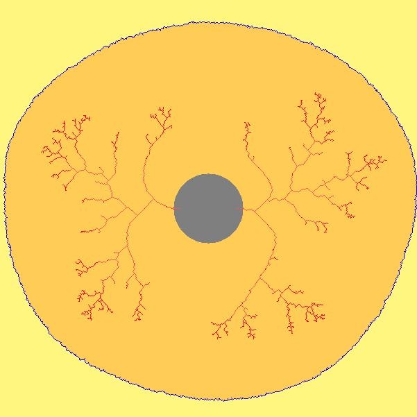 Après de nombreuses études sur les croissances dendritiques, nous avons essayé d'appliquer "l'artillerie lourde" de la physique à des systèmes biologiques, car on s'est assez tôt aperçu qu'il y avait des points communs entre ces croissances purement physiques, et des croissances biologiques, comme la croissance des vaisseaux sanguins ou des reins. Ce rapprochement s'est révélé très fructueux, pour des raisons profondes liées à "l'universalité" des formes (voir plus loin).