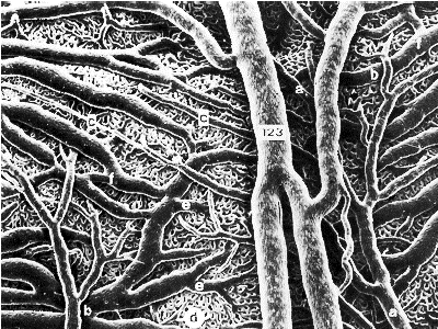 Légende: Image de vaisseaux sanguins à 3D, moulage de l'intérieur des vaisseaux obtenu par P. Simoens, docteur de l'Université de Gand