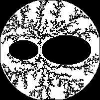 Légende: Simulation de la formation de la vasculature du sac vitellin de lembryon de poulet, les ovales noirs représentents chématiquement lembryon. Les vaisseaux visibles ici (en noir) sont en fait des vaisseaux plus gros obtenus en élargissant les plus fins (non visibles) dans les directions où l'écoulement est plus fort. Finalement, ce mécanisme de formation est assez proche de la formation des rigoles dans le sable, à marée basse, sur les plages, qui donne des "vaisseaux" comme ceux de la figure suivante : Légende: Image de rigoles dans le sable, sur la plage de Jullouville à côté de Granville (Manche).