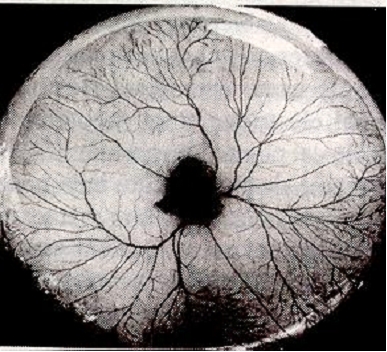 En utilisant cette analogie on peut construire une vasculature réaliste dans un cas simple comme celui du sac vitellin de lembryon de poulet. Le sac vitellin de l'embryon de poulet est une petite peau qui entoure le jaune, on peut la deviner même sur un oeuf de consommation courante, c'est un peu l'équivalent du placenta chez les mammifères. Evidemment, l'oeuf que vous avez dans votre frigidaire ne développe pas de vaisseaux sanguins car il n'est pas fécondé.