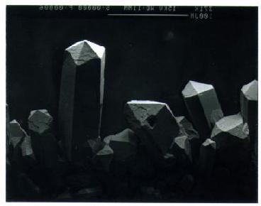 | Cristaux de cuivre plus allongés, obtenus en croissance électrochimique très lente (deux jours pour 200 microns de long env.) | ![]() |