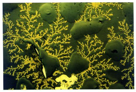 | Croissance arborescente de cuivre planaire, en présence de rayures "aléatoires" simplement dues au contact des lamesau moment du nettoyage. (Largeur trois millimètres env.) . | ![]() |