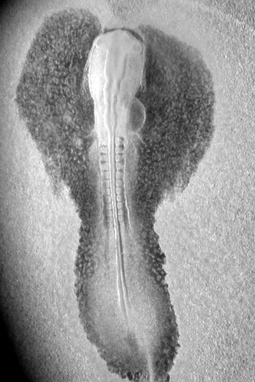 Photo d'un jeune embryon de poulet, au départ d'un film en Time-Lapse, à un stade légèrement ultérieur.