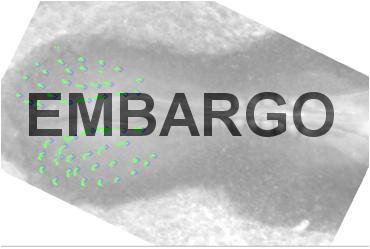 Ci-dessous, tracking de cellules par la méthode de la PIV, in vivo, dans un embryon de poulet (les croix bleus suivent les trajectoires des cellules, représentées en vert, et superposées sur le dernier plan du film). On assiste ici à l'enroulement de la région des cuisses (qui a lieu légèrement avant les pattes avant à cause de l'ouverture dans la régionde la crête neurale, voir mon livre de l'Oeuf à l'éternité). La fenêtre expérimentale ci-dessous est d'environ 3 heures (en réalité, le film disponible est beaucoup plus long, mais sur la fin, l'embryon décède, je ne conserve pour analyse que la partie où la dynamique de formation des somites est suffisamment régulière pour admettre que l'embryon est dans son état normal). On observe l'allongement vers l'arrière qui entraîne par conservation l'enroulement de la hanche, qui recircule en s'aplatissant (effet de conservation du flux). Ce pattern d'écoulement est une conséquence de (div (V)=0, associée au caractère conservatif de l'écoulement -sur la durée d'un film, la croissance est négligeable). Nous mesurons aussi la contrainte par tonométrie (soumis). Des stades antérieurs et postérieurs sont également disponibles, les trajets cellulaires sont en cours d'analyse (ça tourne vers l'arrière, et vers l'avant). Les films à basse résolution sont à l'échelle 0.33 du film initial. Ces images sont produites sans aucun marquage, ce qui n'est pas nécessaire, compte tenu de la qualité des images. La PIV suit les points de référence très bien. La technique de culture est shell-less. Incubateur Minitüb gmbh. Microscope Leica. caméra Watek. Logiciel NIH Image de Wayne Rasband. Carte Scion. Plugin Tracker.