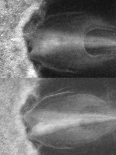 Stage : Formation de la tête et de la poche cardiaque. Grossissement : X2 pour la vue de dessous, X3,5 pour la vue de dessus. Caméra: Watec NetB, 768x512 pixels. Remarques d'intérêt général : C'est le même embryon en vue ventrale (à gauche) et dorsale à droite)