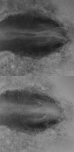 Caméras: Watec NetB, 768x512 pixels. Remarques : Formidable film double de la formation de l'embryon, en vue par dessus et vue par dessous, sur le même embryon simultanément. (Un peu de bruit est dû à un défaut de Sync. entre les deux caméras en cours de réglage). Second film double de la formation de l'embryon, en vue par dessus et vue par dessous, sur le même embryon simultanément. Remarquez l'applatissement le long du dos, la poussée bi-directionnelle et l'emmanchement comme un doigt de gant de la poche gastro-cardiaque. La nature physique du processus est particulièrement évidente. |