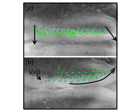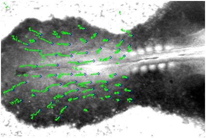 | This is an in vivo movie of 3 hours of collision of the folds, and below, the cell tracking at this time, just prior to the collision, and just after the collision. It shows the transition between a dipolar flow, and a quadrupolar flow. |