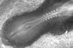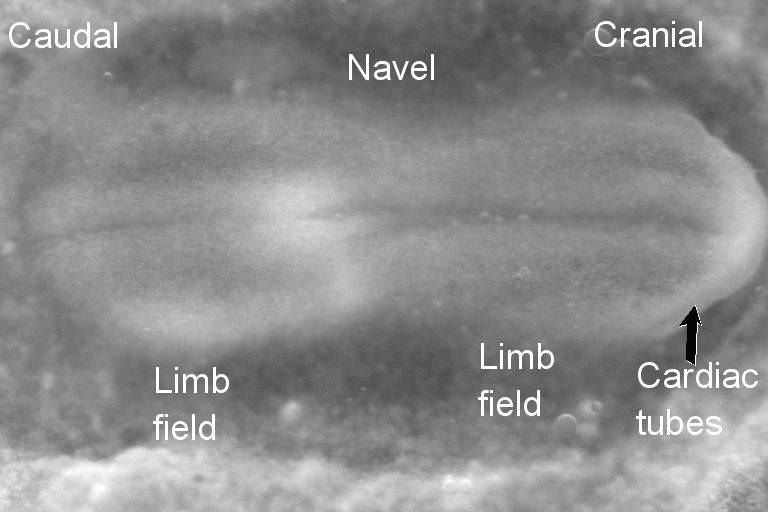 | This is an in vivo image of an embryo at the stage called "neural crest" The embryo has folded, the folds have an "8" shape, and begin to collide | ![]() |