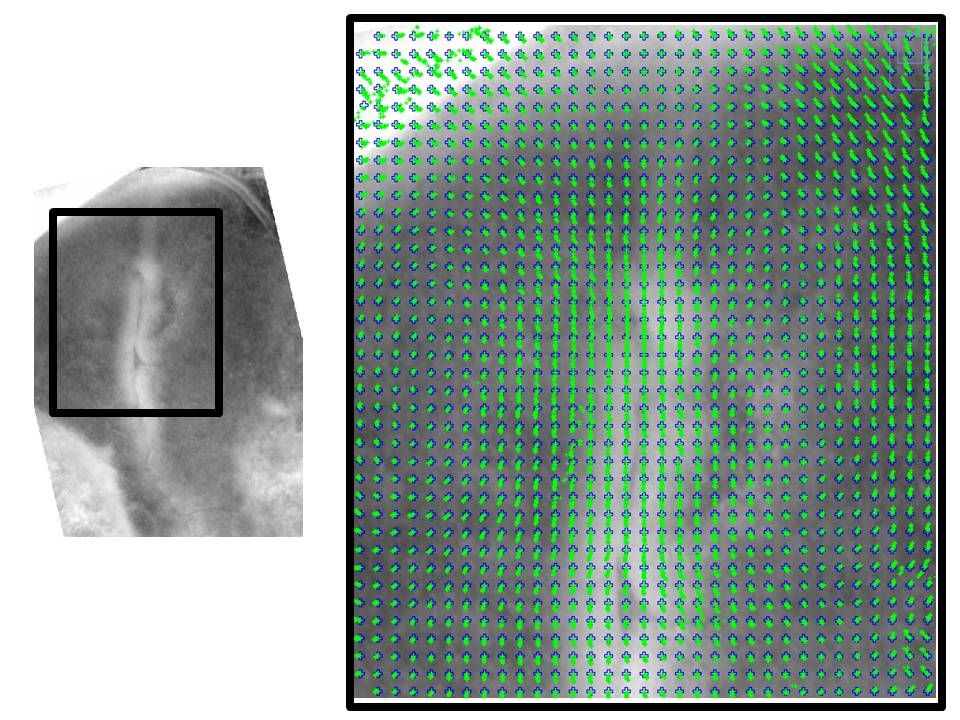 | This is an in vivo image of an embryo at the early gastrula stage. The box shows the vector field. The green tracks represent 30' of tracking of the blue cross, overlaid on the starting frame. The frames were acquired at a rate of 30 secs. The magnification is 4x on the binocular Leica MZFLIII, + a 0.63 lens on the trinocular tube, and the data are acquired by a 1/2" CCD camera, high sensitivity monochrome from Watec. | ![]() |