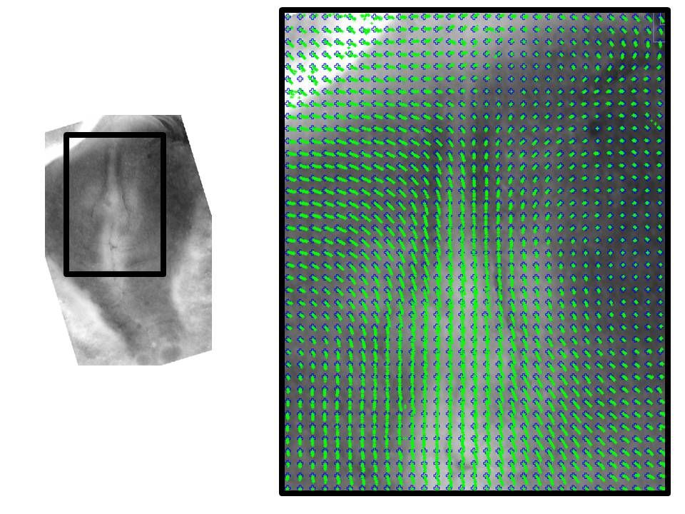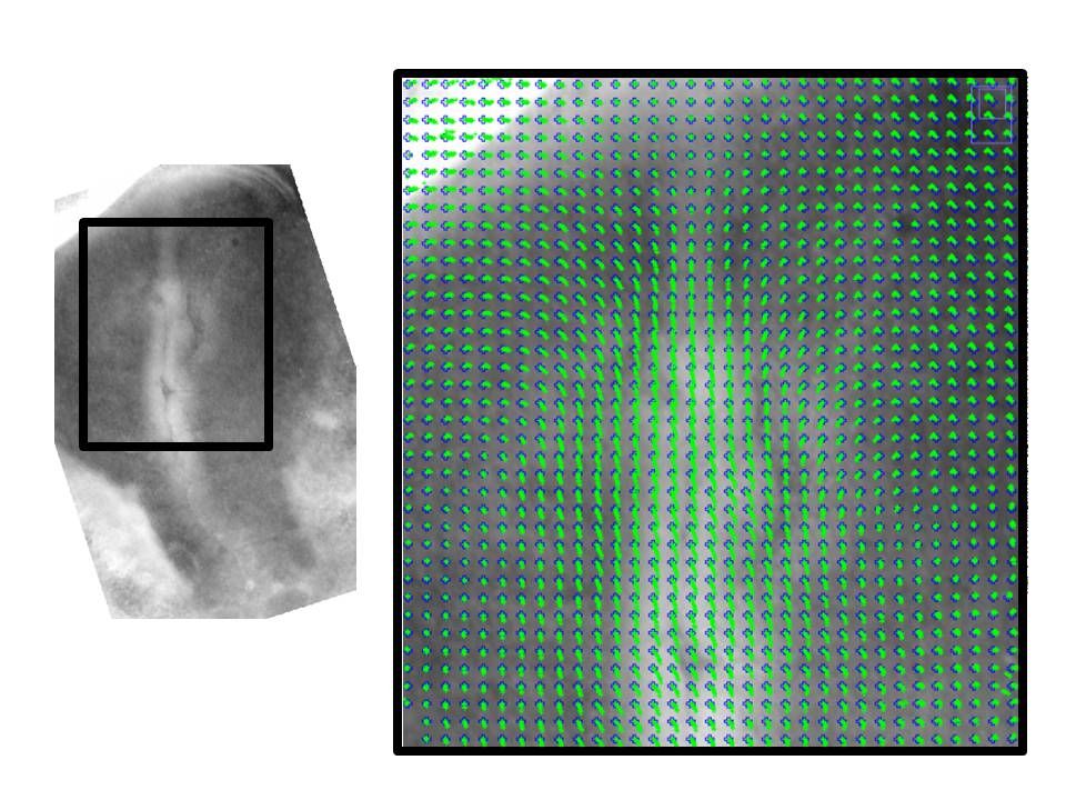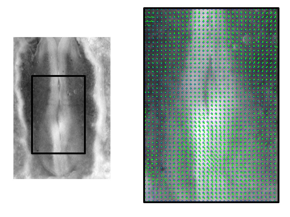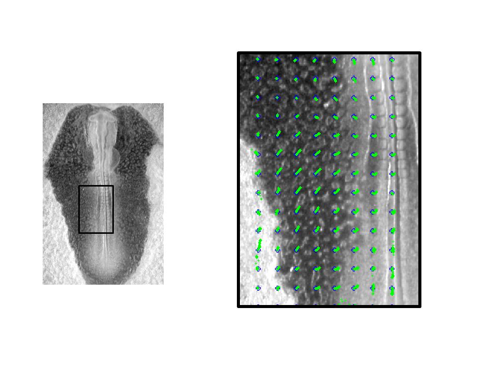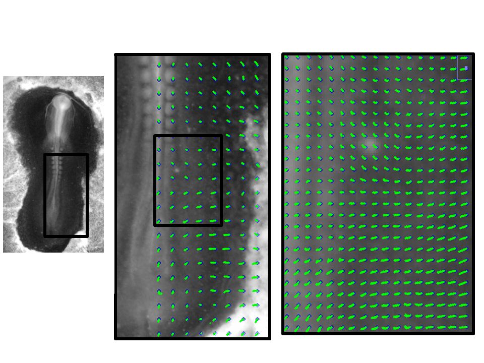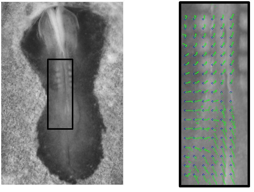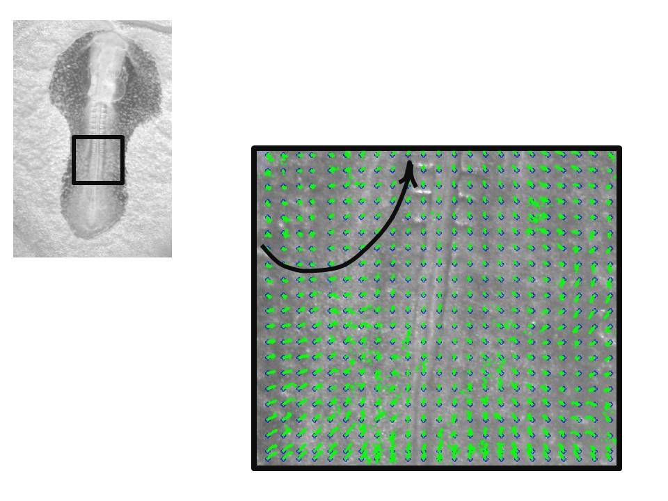 | This is an in vivo picture of the flow at the time of formation of the lateral plate. The box shows the flow pattern. The winding brings the tissue towards the median axis, while the median axis extends. The entire visco-elastic fields ends in segregation of the median axis, and the lateral plates, by a fold occuring visco-elastically. Meanwhile, the lateral plates start to rpotrude in 3D. |