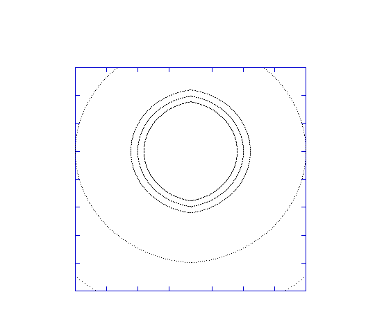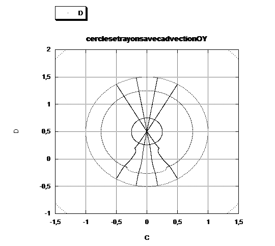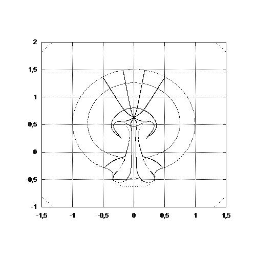 | This is the animation of the flow of a circle into a dipolar flow, with invagination along the midline. The balstula is supposed to be circular, and to behave like a viscous material at long times. It is supposed to be incompressible, and thin. The flow is supposed to act along a central furrow (the primitive streak), pulling forward the tissue towards the midline. There, the tissue disapepars underneath, this implies a free condition for the flow along the furrow. In this case, the flow is not conservative : the blastula loses matter underneath (for extra-embryonic organs, eventually, and some other parts). |