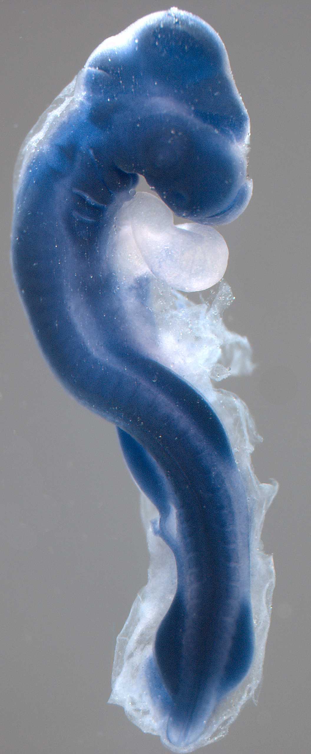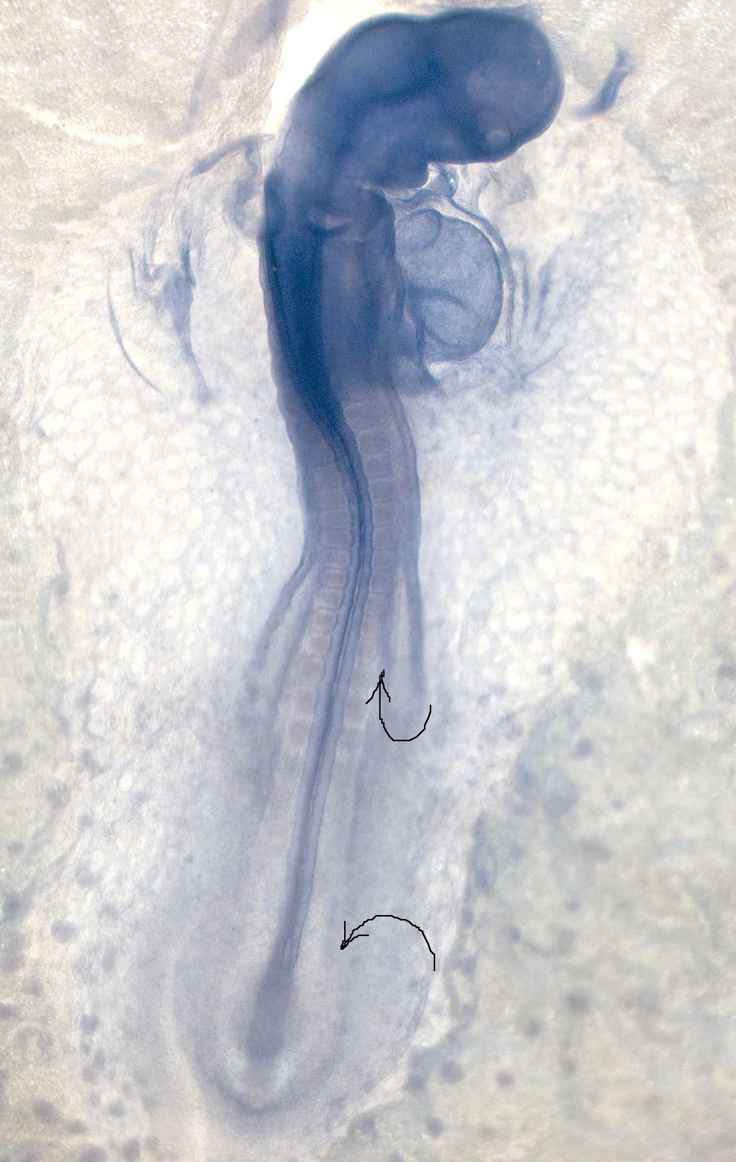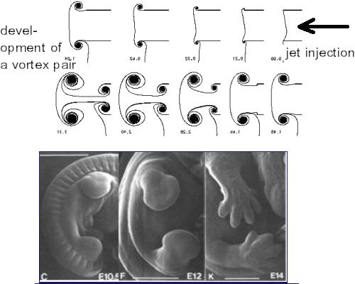 l'autre est l'image d'un embryon de souris à quelques jours de développement. Ces deux images illustrent mon point de vue sur la dynamique de formation des plans animaux. Il ne s'agit pas d'une analogie. Je pense réellement que l'enroulement du corps des animaux aboutissant à la formation du dos et des membres est un enroulement de type tourbillon. Mais il s'agira de deux paires de tourbillon entrant en collision. Dans le cas des embryons, ces jets sont initiés dans la blastula (qui est 2D ou quasi 2D) et se propagent tous seuls, jusqu'à flamber à 3D, et former le corps de l'embryon, avec sa courbure bien connue, et la position des bourrelets des pattes.
