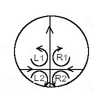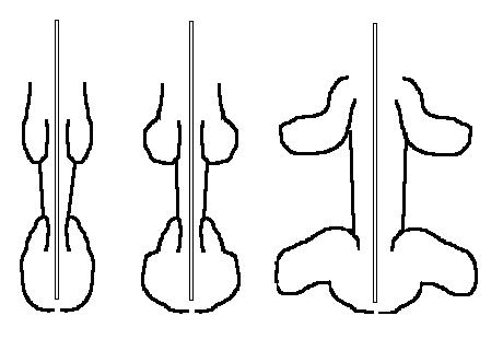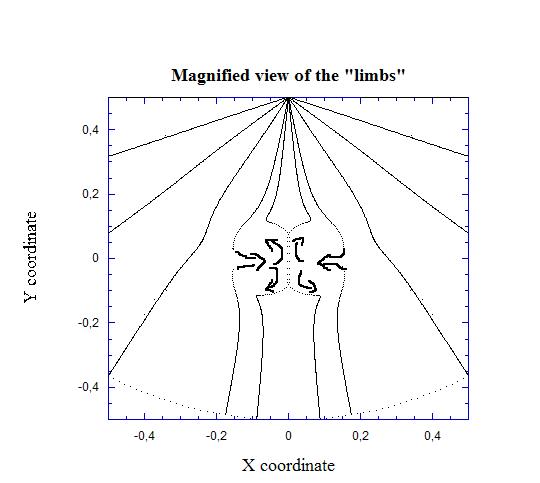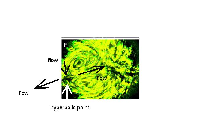 Pour résumer : La vraie, la seule question est : l'établissement des pattes avant et arrière est-elle la conséquence d'une interprétation par les cellules de la plaque latérale d'un niveau-seuil d'un certain morphogène le long d'un gradient antero-posterieur (hypothèse d'information de position représentée par un gradient) ou bien la conséquence d'une brisure de symétrie unique provoquant un éclatement en quatre zones à recirculations en miroir autour du nombril, ces recirculations provoquant des gradients de pression qui "lancent" les membres. Ce point est le seul qui vaille d'être discuté à ce stade de précision des données, et tout démontre que la seconde assertion est la bonne : les 4 pattes s'établissent ensemble, de par la formation d'un écoulement hyperbolique autour du nombril. L'enroulement hyperbolique ci dessous :