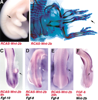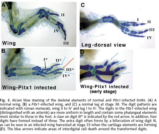 Réponse: cette soit-disant ressemblance de l'aile transfectée, avec la jambe (du poulet) est psychosomatique. Au cours de la formation du plan tétrapode, l'enroulement de la blastula cause une courbure inverse des bourgeons de "bras" et de "jambes", en sorte qu'on doit s'attendre, dans mon modèle à des coudes et des genoux à symétrie miroir, les extrémités pouvant avoir n'importe quelle symétrie (voir mon livre). Les animaux transfectés pour avoir des ailes qui ressemblent aux pattes n'ont que la partie distale modifiée, dans un sens "plus patteux". Les flexions aux coudes et aux genoux sont conservées, et ces articulations plient bien à symétrie miroir (le "bras" cubitus-radius vers le haut, la patte tibia-péroné vers le bas), comme prédit par mon modèle. En particulier, la figure suivante d'un article qui fait ce genre de manips montre un "bras" transfecté qui ressemble à une "jambe" wild type, mais.... les orientations des corps sont en sens inverse sur les photos.