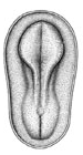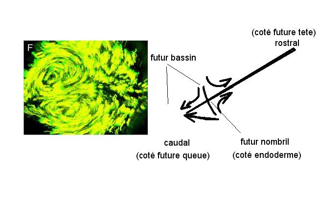 (extraite -figure 10- de mon article "la mathématisation complète d'un vertébré s'avère possible", in Revue des questions scientifiques, Namur, 2006. Un paramètre du modèle fixé par la brisure de symétrie initiale est la position du centre de l'écoulement, situé dans le monde réel assez bas vers le bord de la blastula).