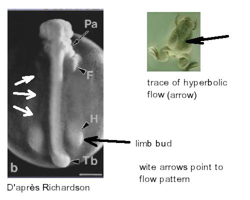 Les articles existant en rapport avec la formation des pattes mentionnent tous que le membre "vrai" part de la "plaque latérale". Rien n'est expliqué sur l'origine de la plaque latérale. S'agissant des sens de rotation des coudes et des genoux, et ma théorie est parfaitement en accord avec ce qui est observé, Je peux bien sûr me tromper, c'est-à-dire qu'il est possible que ces membres soient aberrants pour la raison qu'ils sont mal positionnés, rentrés de force etc., mais que le bon positionnement soit dû à une induction génétique enchaînée par une autre, et une autre, etc. le long de l'axe antero-posterieur et que cela n'ait rien à voir avec la biomécanique de l'écoulement de la blastula. Cependant rien dans ces expériences ectopiques ne permet de dire comment est défini le point de croissance du membre normal, alors que ma théorie l'explique très bien.