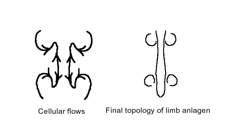but, as a consequence of the flow map, the areas of the flows have mirror symmetry around the navel whatever the genes expressed in these areas, the boundary condition created by the rotation has mirror symmetry, and the true limbs will form with approximately a mirror symmetry, the arm flexing towards the head after the elbow, and the leg flexing towards the tail after the knee