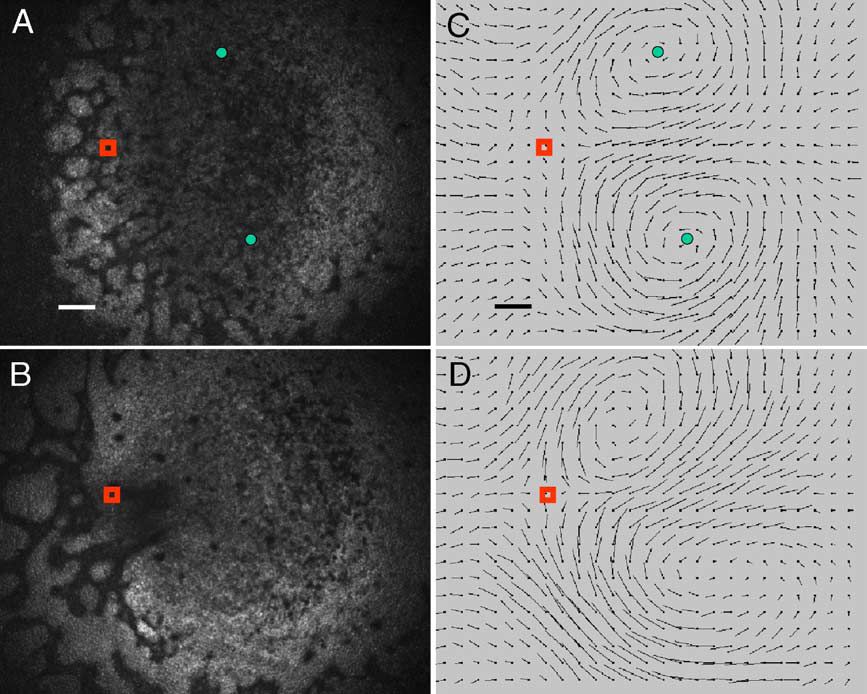 Fig. 2. Velocity vector fields of cells in the embryo during streak formation. (A, B) Brightfield images of the developing embryo shown in Fig. 3 at 40 min (before streak formation) and 320 min (after streak formation) after the start of the recording. (C, D) Corresponding velocity vector fields calculated over the last 10 consecutive images taken 4 min apart. The red box indicates the saddle-point area where the cell flows merge and bifurcate along the anterior– posterior axis. The green points in panels (A) and (C) indicate the quiescent points of low flow. The vectors show the average velocities calculated over 10 frames (40 min). The white scale bar in panel (A) is 250 Am, the black scale bar in panel (C) represents a velocity of 1 Am/min. See supplementary material movie 3 for a dynamic presentation of this experiment.